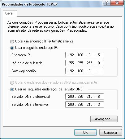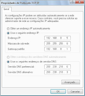 Agora volte às conexões de rede>protocolo TPC/IP (Janela que ainda deveria estar aberta), marque a opção “Usar o seguinte endereço IP” e preencha os campos com as informações que você acabou de anotar. (tirando endereço IP que você deve colocar o formato do antigo e chutar um último valor qualquer entre 2 e 255, desde que não esteja sendo usado por outro computador.